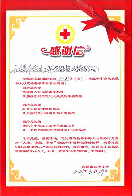 為進一步踐行社會主義核心價值觀,大力弘揚“人道、博愛、奉獻”的紅十字精神,倡導“互助、環保、節能、公益”的社會理念,根據市委市級機關工委、市文明辦、市紅十字會《紅十字愛心衣物捐贈倡議書》精神,我公司積極組織,大家踴躍捐出款式新、質量好的衣物并主動利用節假日期間對所捐衣物進行清洗、晾曬、消毒,確保捐贈的愛心衣物符合要求,并于2021年1月29日下午將所捐衣物送至無錫市紅十字會。
