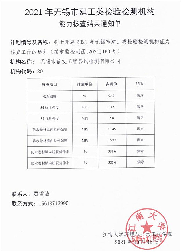 2021年無錫市建工類檢驗檢測項目能力核查公司獲滿意